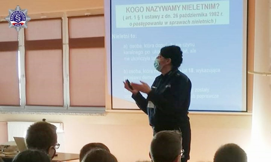 Mundurowi przekazali także podstawowe informacje dotyczące odpowiedzialności karnej nieletnich oraz przejawów demoralizacji. Uczniowie zostali zapoznani z podstawowymi pojęciami: nieletni, małoletni, czyn karalny czy też demoralizacja oraz dowiedzieli się, jakie są konsekwencje prawne popełnienia takich czynów i jakimi środkami oddziaływania wychowawczego dysponuje Policja oraz Sąd rodzinny.