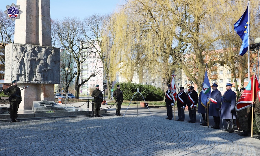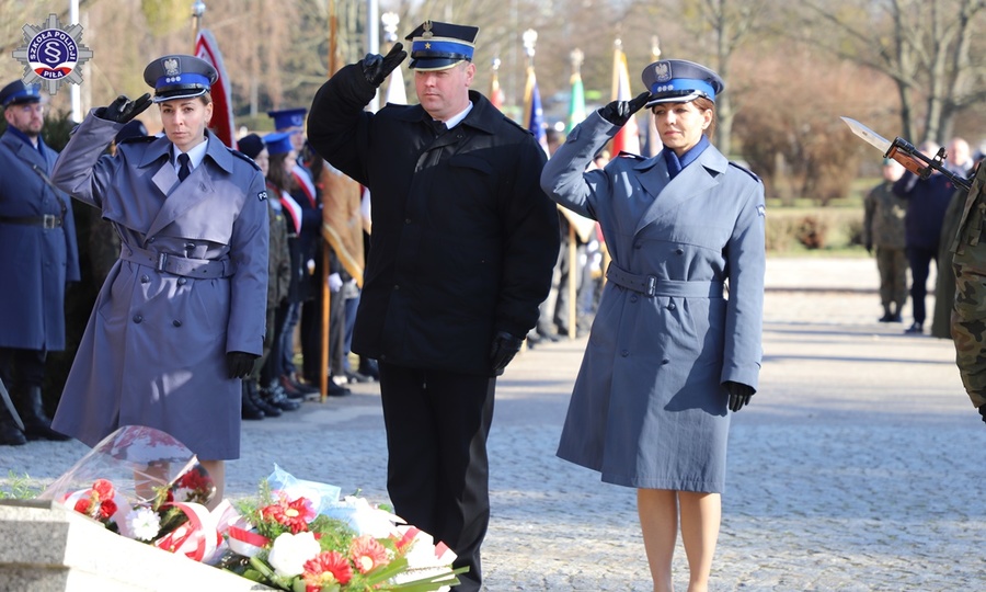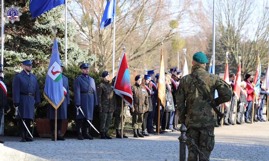 W samo południe liczne delegacje władz, instytucji i organizacji w obecności pocztów sztandarowych i wojska, złożyły kwiaty pod pomnikiem. Szkołę reprezentowała Pani Zastępca Komendanta Szkoły insp. Agnieszka Kozłowska-Kordy oraz poczet sztandarowy w składzie: dowódca pocztu podkom. Paweł Deutsch, sztandarowy asp. Przemysław Wypuść oraz asystujący sierż. szt. Paweł Borowczyk.