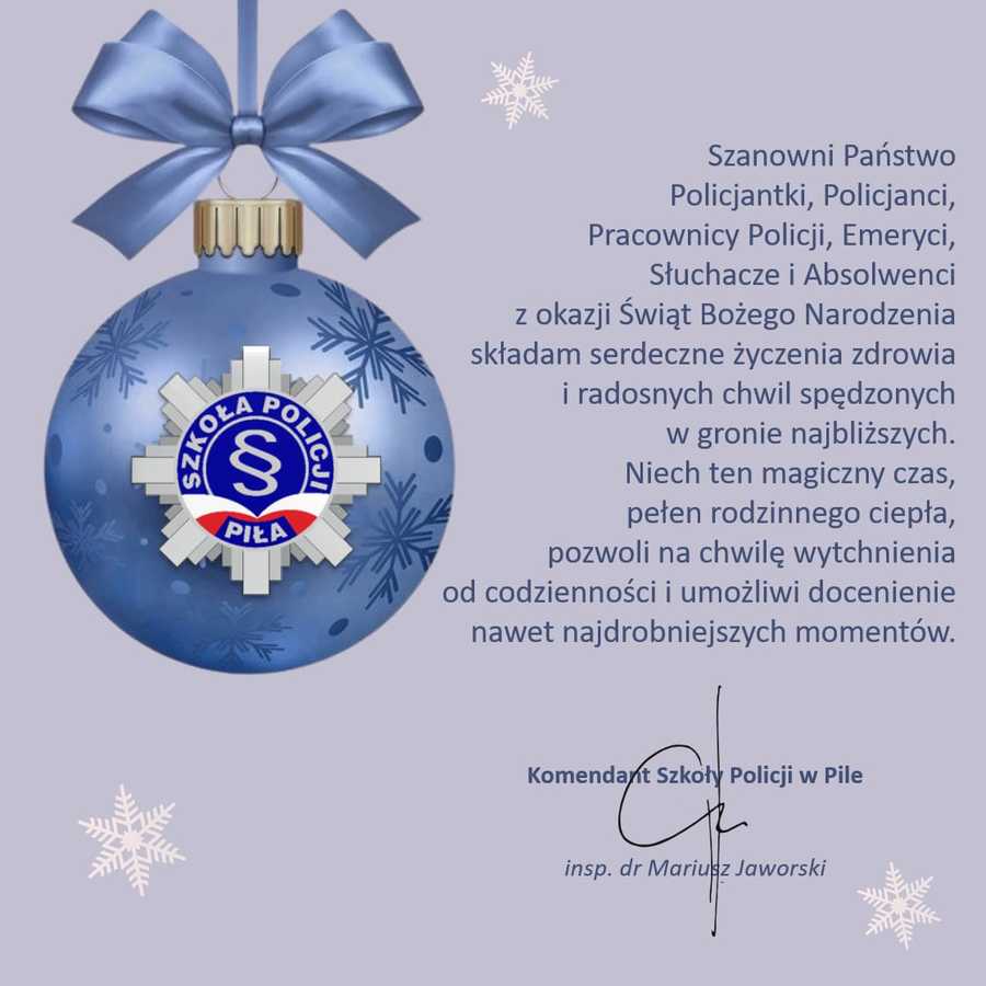 Z okazji Świąt Bożego Narodzenia i Nowego Roku Komendant Szkoły Policji w Pile insp. dr. Mariusz Jaworski w imieniu własnym i kierownictwa szkoły, złożył życzenia wszystkim pracownikom i funkcjonariuszom Policji, emerytom, słuchaczom oraz absolwentom.